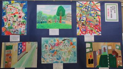 図工で取り組んだ作品の中から、「郷土を描く美術展」で入選した作品が、職員室前の廊下に飾られています。どの作品も丁寧に多彩な色付けがされており、見る人の心を引き付けます。音楽会でお越しになったときにお立ち寄りください。