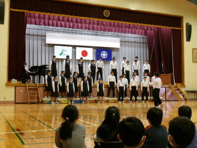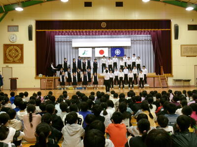 11月7日(金) 鴻巣南中学校3年1組の皆さんとの音楽交流会が行われました。「Replay」という曲を混声三部合唱で聞かせてくれました。南中生3年1組全員の歌う態度や表情はもちろん、きれいなハーモニー、特に男声パートの美しい歌声に、馬室小の児童は皆引き込まれていました。最後に合同合唱での「翼をください」は、体育館に全員の元気な歌声が響きました。翌日に音楽会を控えた児童たちにとって、中学生の素晴らしいお手本を見せてもらうことができました。