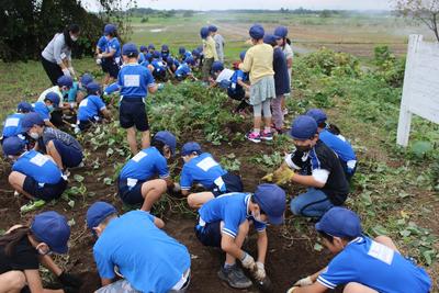 本日(15日・木)の1・2時間目に2年生が「馬室っ子農園」でさつまいもほりを行いました。