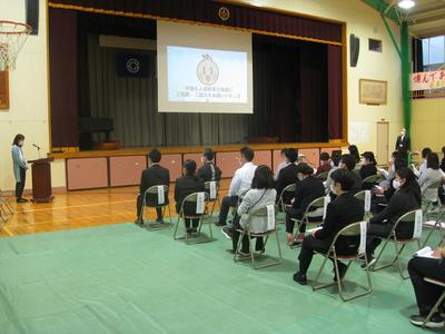 校長からは、3学期は短い学期ですが、1年の締めくくりと同時に、次の学年に向けての準備をしてほしい、そのために①今の学年の学習をしっかり身に付けること②一つ上の学年の様子をよく見ておくこと、という旨の話をしました。