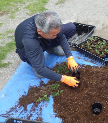 花壇に植えるには小さい苗だったので、職員がポットに植え替えました。