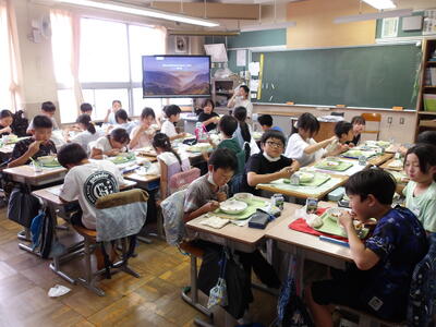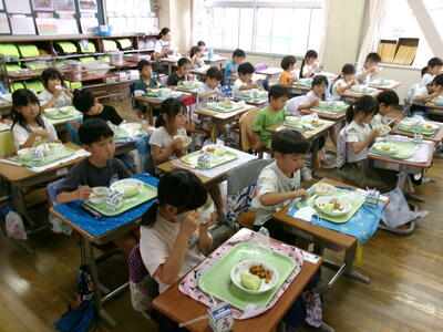 2年1組の給食の様子をお届けします。給食の配膳もずいぶんと慣れてきて、みんなで協力して準備を行うことができました。当番の子のあいさつに合わせて「いただきます!」と元気いっぱいの声で給食を食べ始めました。この日も気温や湿度が高い日でしたが、蒸し暑さにもま負けず笑顔で美味しくいただくことができました。