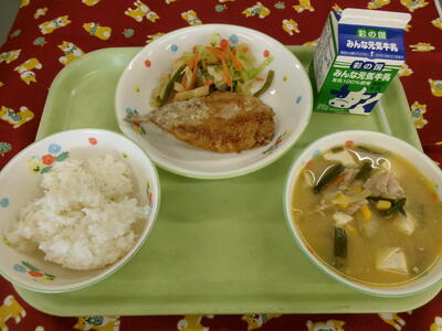 今日は、アジについて紹介します。アジは魚の中でもタンパク質が多く含まれているそうです。それは、体を作るもとになる成分が多いということと、「うまみ」もたくさん含まれているということになります。おいしいアジが運動会練習を頑張る体に嬉しいメニューでした。