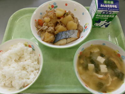 1月27日(火)のメニュー:牛乳、ごはん、のり、鮭の塩焼き、五目煮豆、じゃがいものみそ汁